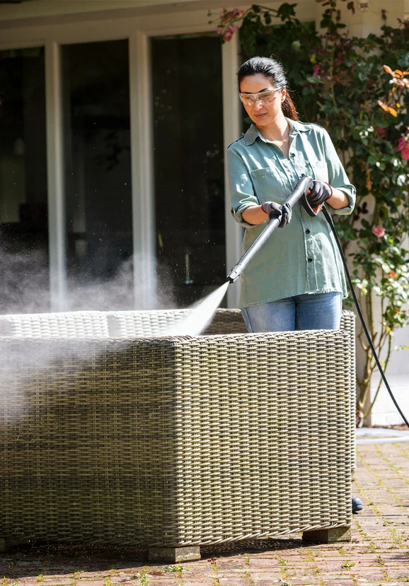 Der Hochdruckreiniger entfernt dank der Kraft des Hochdruckwasserstrahls mühelos den hartnäckigsten Schmutz von Außenflächen wie Wänden, Böden und sogar Gartenmöbeln.